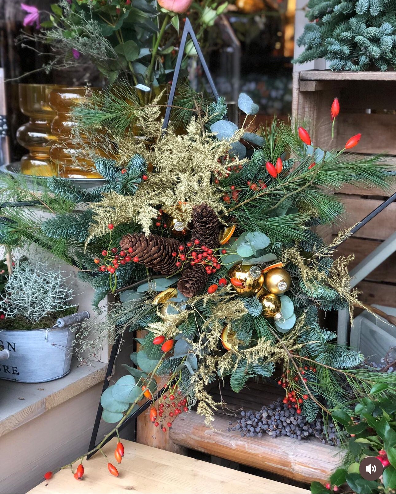 Het stuk hangt in de ster en is gemaakt met verse groen soorten die mooi indrogen waardoor je er lang plezier van hebt. Lampjes kunnen extra worden bij besteld.