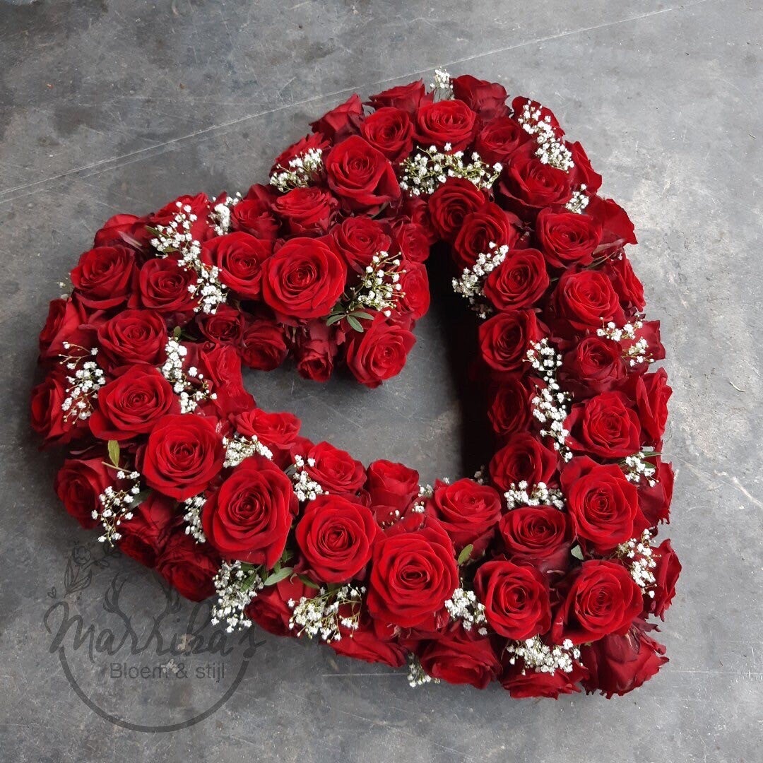 Een hart gevuld met liefde en prachtige rode rozen passend bij de dierbare die je zojuist verloren bent.